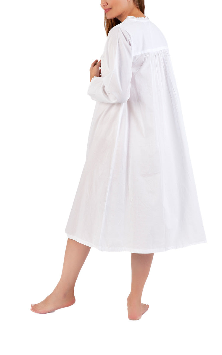 Tina is a popular long sleeve nightgown with a V neckline with a delicate ruffle trim.  Featuring a button up bodice and feminine pleating and embroidery on the front.   The fabric is breathable, soft and comfortable to wear and is indeed a trans seasonal nightgown. This style is a popular choice in crisp, fresh plain white cotton.