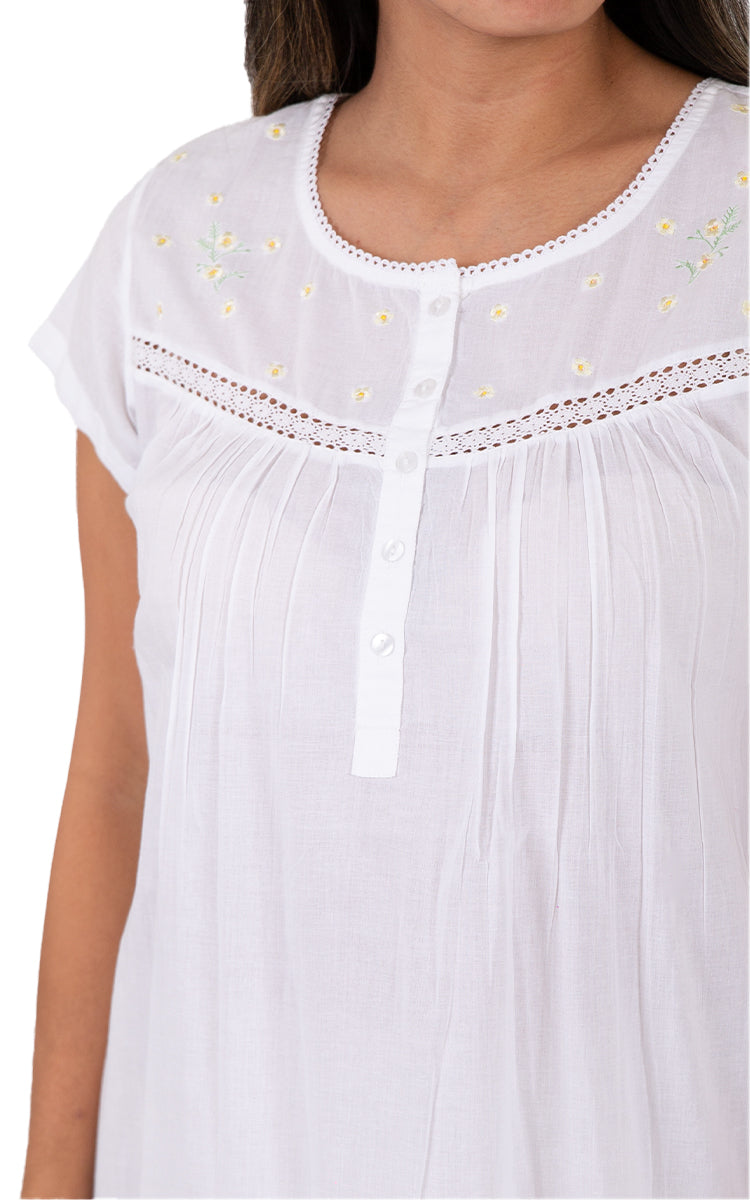 French Country 100% Cotton Nightgown with Cap Sleeve in White FCW127