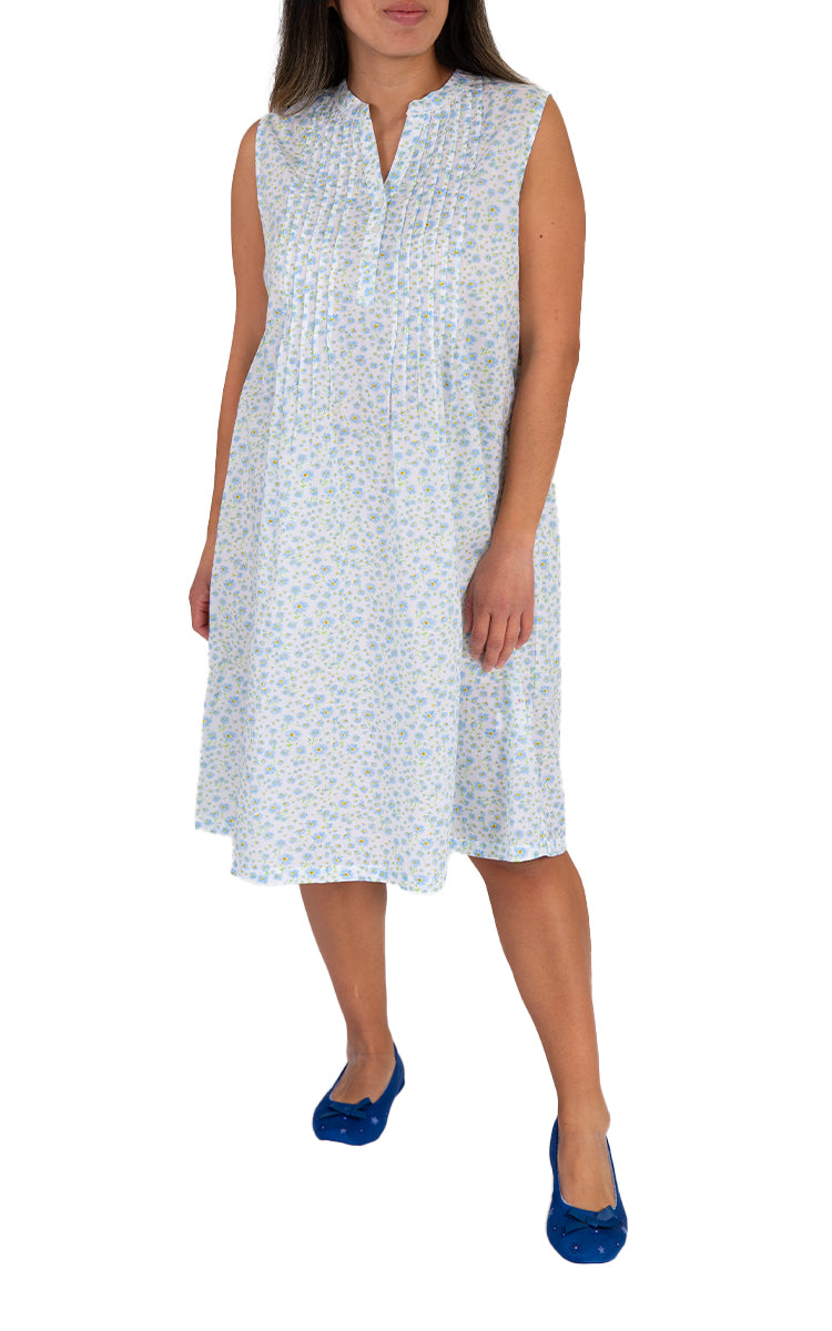 Enjoy your night-time and morning rituals in our white with blue daisy French Country sleeveless nightie featuring mandarin neckline. Made from high-quality woven cotton that provides a soft and comfortable feel against the skin. The non-stretch fabric is lightweight and breathable and sits knee length.