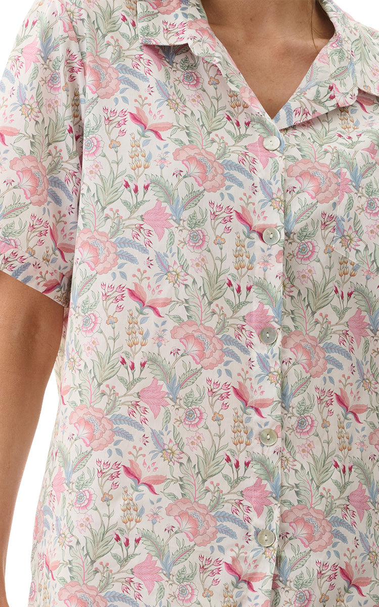 A comfortable and cool pyjama in a non-stretch cotton fabric. Button up short sleeve pyjama with 7/8 length pant in non stretch woven 100% cotton fabric.