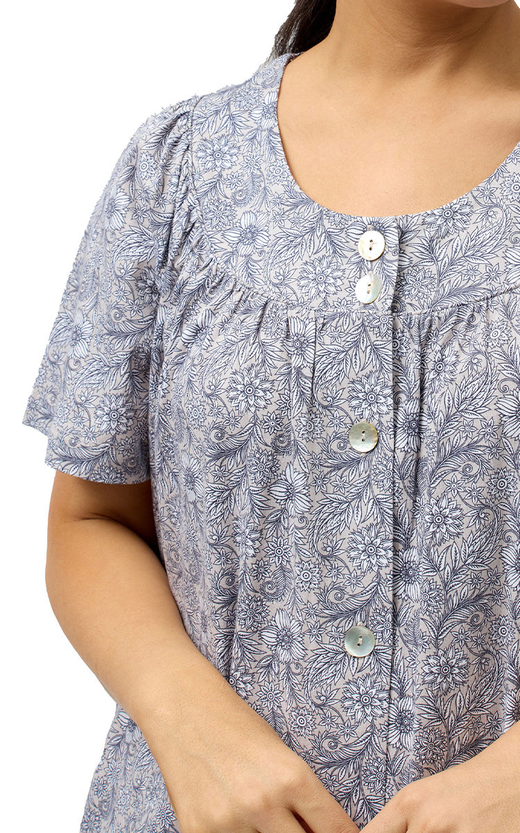 Stay cool and comfortable this spring and summer with our short sleeve brunchcoat made from pure cotton. The breathable material has a floral pattern in mocca colour. Perfect for lounging or sleeping, this loose-fitting nightgown is a must-have for your summer wardrobe. Get yours today! Perfect for women in nursing homes.