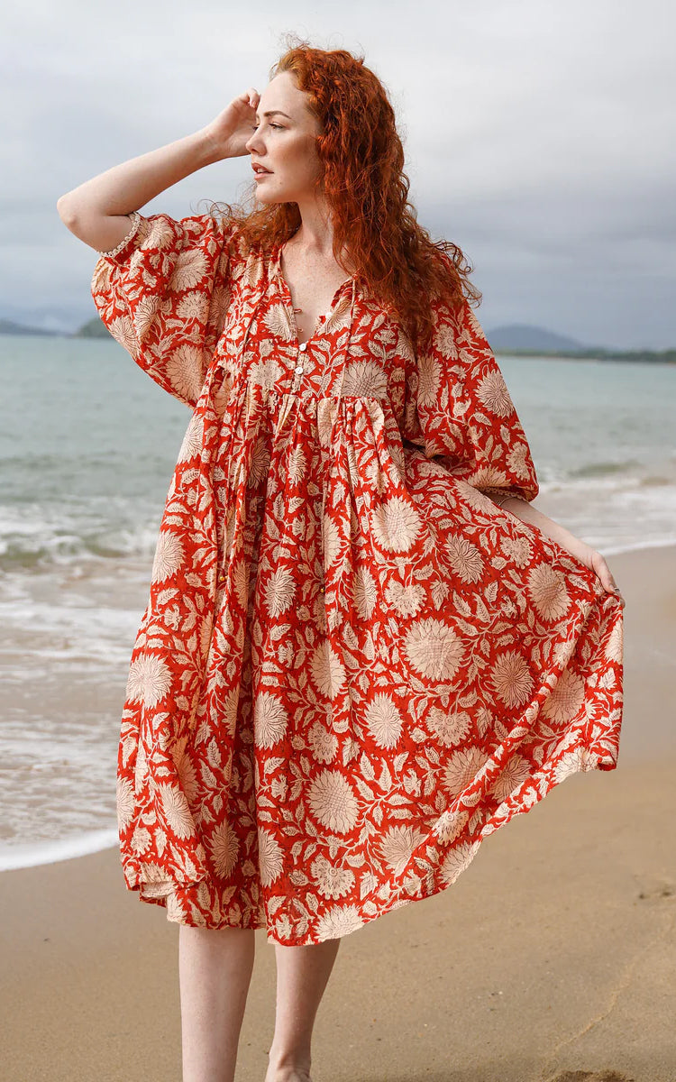 River Goddess 100% Cotton Midi Dress Hawa Rust Sunflower